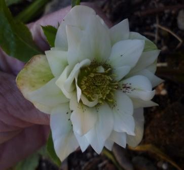 het snertweer. Ook staat ook een roze helleborus met een enkel sproetje,